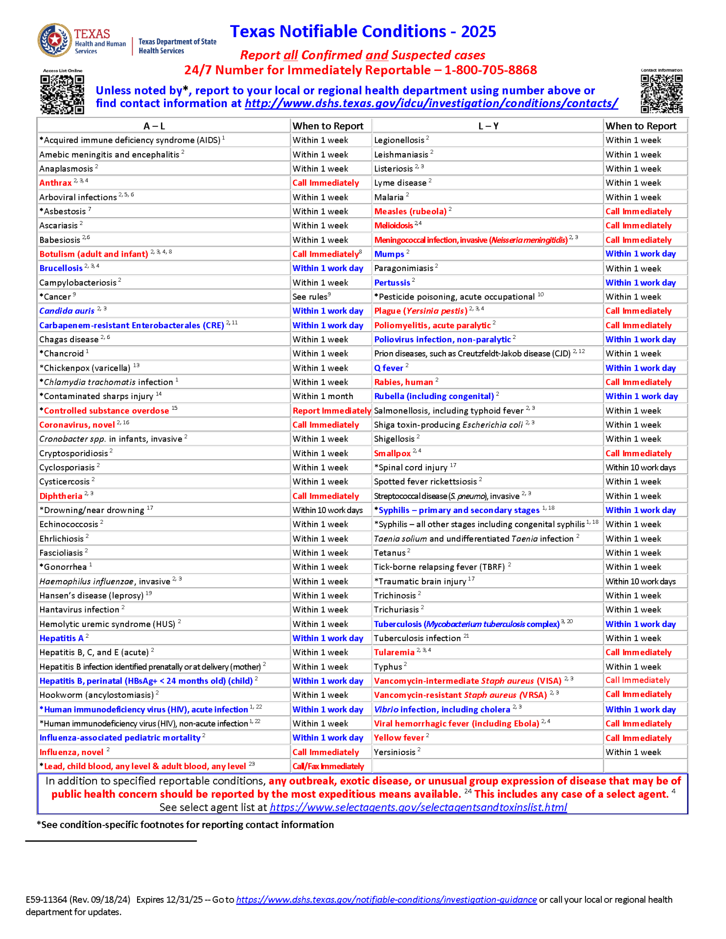 Confirmed or suspected cases of the following and any outbreaks, exotic disease, or unusual group expression of illness, for a listing go to: Texas Notifiable Conditions